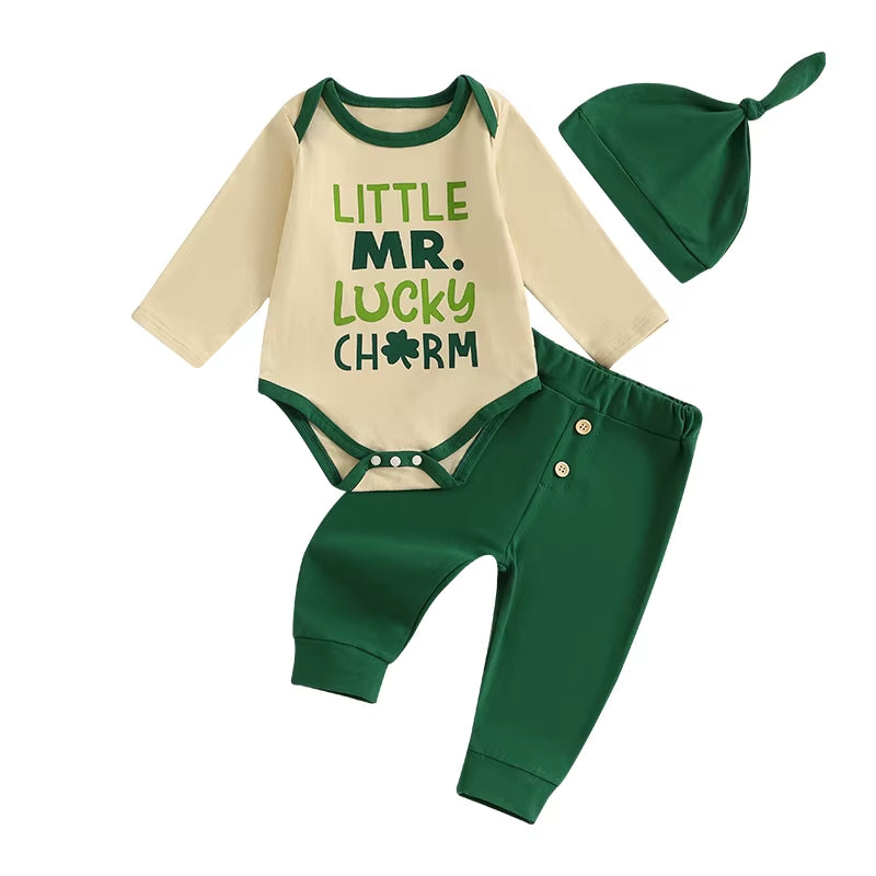 Baby Boy First St. Patrick's Day Outfit with Hat - Little Mr Lucky Charm. Adorable Set with Hat. Perfect for any St Patrick's Day Plans. Available in various sizes from 0-12 Months.